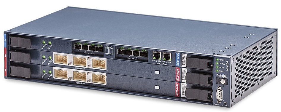 The Actelis Networks ML230 aggregation switch delivers high speed Carrier Ethernet 2.0 services using bonded G.SHDSL and VDSL2 (future) transmission technologies. It is a high density hardened chassis based platform featuring a modular design with advanced redundancy protection schemes, and is suitable for deployment in medium to small COs or remote cabinets.