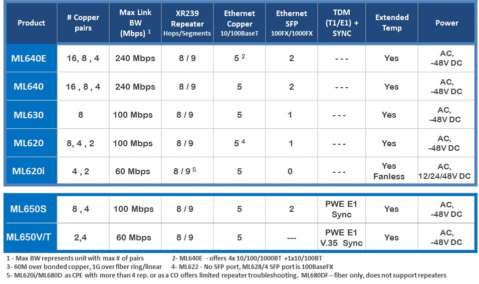 The ML600 portfolio delivers high speed Ethernet over up to 16 bonded copper pairs utilizing G.SHDSL technology.