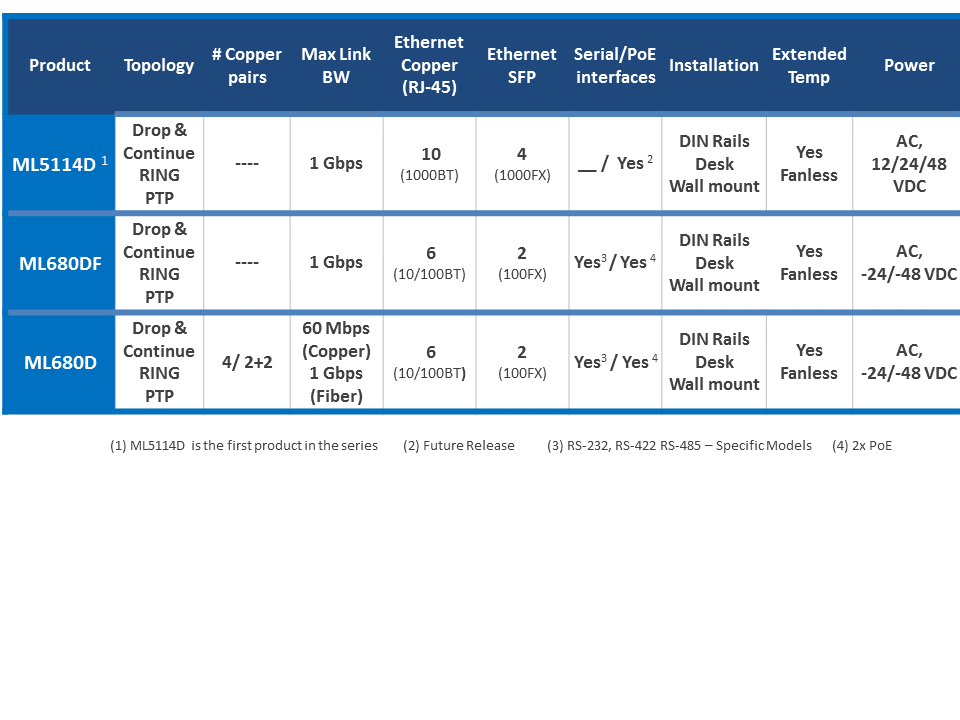 ML510D portfolio expand the existing ML600 and especially ML600D product lines offering similar hardened compact solutions that can be DIN railed or rack mounted. The combined portfolio offers flexible and ideal solutions for rugged intelligent traffic system, surveillance, railway, utility, military and industrial network applications.