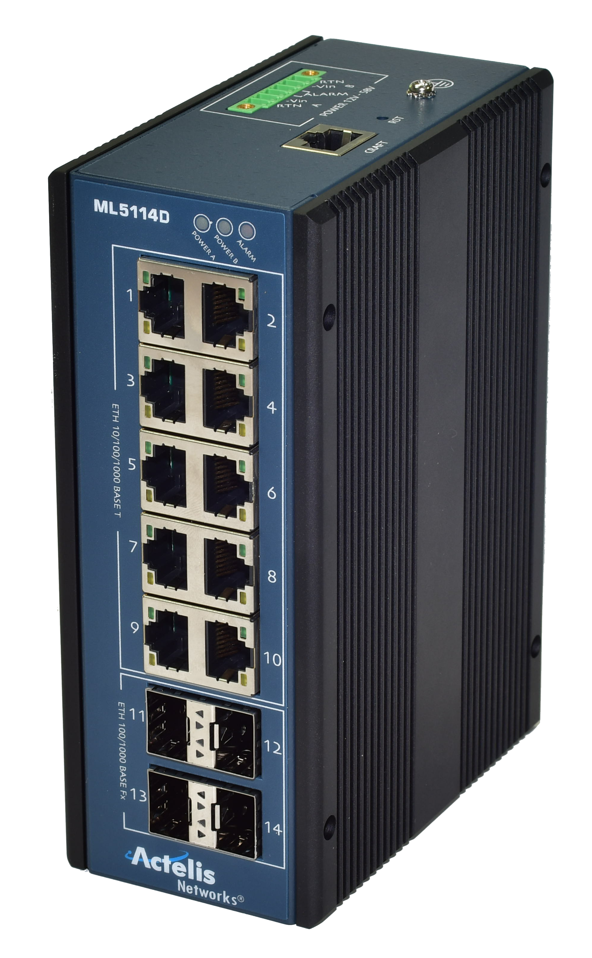 The Actelis Networks ML510D product line offers a cost efficient, compact, hardened, high density Ethernet switches. ML510Da flexible platforms support drop and continue, as well as linear and fast healing ring topologies topologies complementing Actelis' ML68xDx hybrid Fiber Copper solutions. ML510D offers up to 14 x 1Gbps interfaces and is an ideal solution for a variety of private enterprise, intelligent traffic network, Utilities, Military and service provider applications. With its superior density, environmental hardening, small form factor and fanless DIN rail mount design, the ML510D devices can be installed almost anywhere.