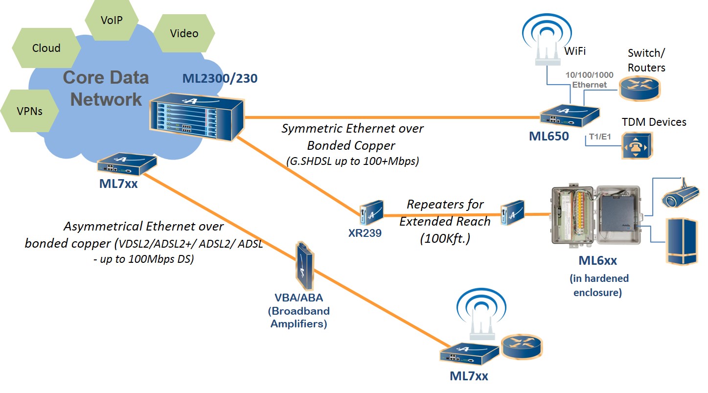 At aggregation points or in the network core, Actelis ML230/2300 aggregation switches provide termination for up to 256 copper pairs, delivering an efficient handoff to collocated IP/MPLS switches, routers, controllers, and other IP equipment via standards compliant interfaces. Optionally, the ML700 can also be deployed at an aggregation node to terminate downstream VDSL/ADSL connected EADs.