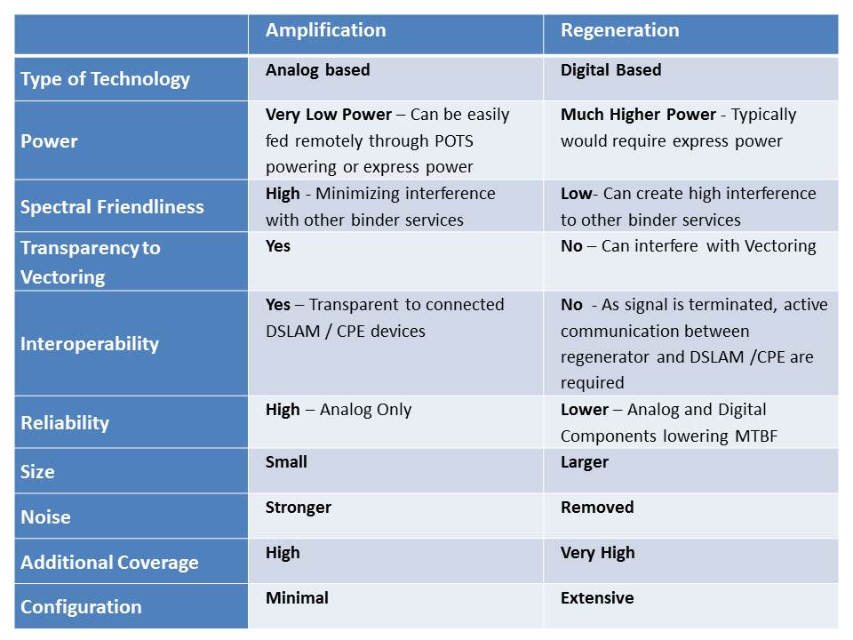 Analog amplification and regeneration are the two most common methods of dealing with increasing the signal power of DSL to enable greater reach (coverage) and bandwidth. An amplifier magnifies the signal without terminating it, while a regenerator terminates the received signal, reshapes and retimes and regenerates. Amplification is typically analog based, while regeneration involves both analog as well as more complex digital processes.